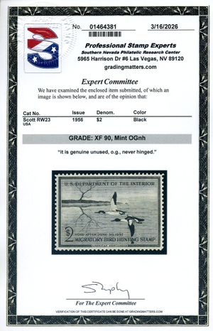 RW23, 1956 Duck Stamp, PSE Graded XF 90 Mint NH Certificate, SMQ $150