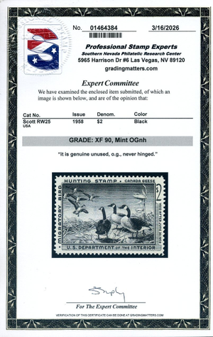 RW25, 1958 Duck Stamp, Mint NH, PSE Graded XF 90 Certificate, SMQ $150
