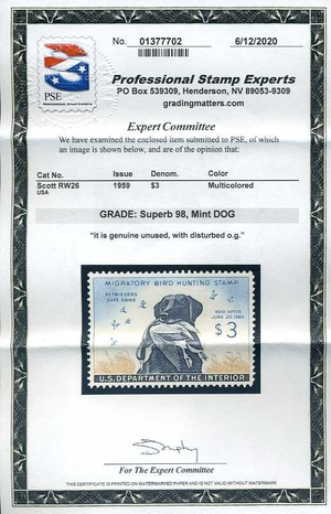 RW26, 1959 Duck Stamp, PSE Graded Superb 98 disturbed o.g. Certificate, SMQ $375