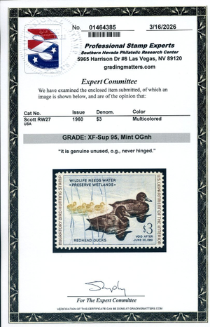RW27, 1960 Duck Stamp, PSE Graded XF-Sup 95 Mint NH Certificate, SMQ $225