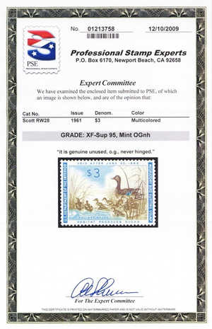 RW28, Mint XF/Superb NH $3 Duck Stamp - PSE Graded 95 * Stuart Katz