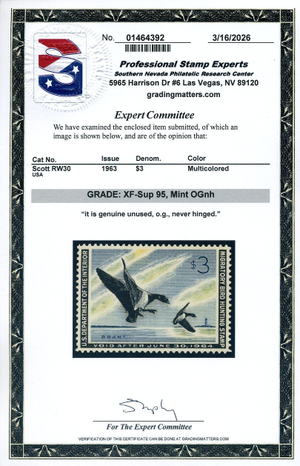 RW30, 1963 Duck Stamp, PSE Graded XF-Sup 95 Mint NH Certificate, SMQ $225