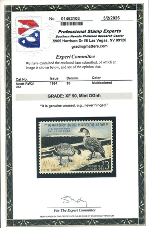 RW31, 1964 Duck Stamp, PSE Graded XF 90 Mint NH Certificate, SMQ $175