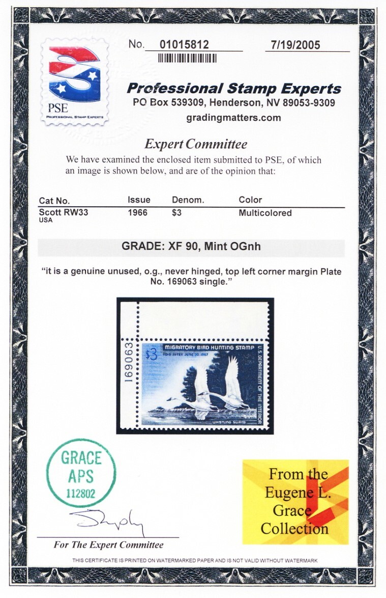 RW33, Mint NH XF $3 Duck Stamp - PSE Graded 90 Certificate * Stuart Katz