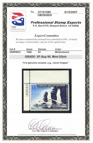 RW33, Mint XF/Superb NH $3 Duck PL# Stamp - PSE Graded 95 * Stuart Katz