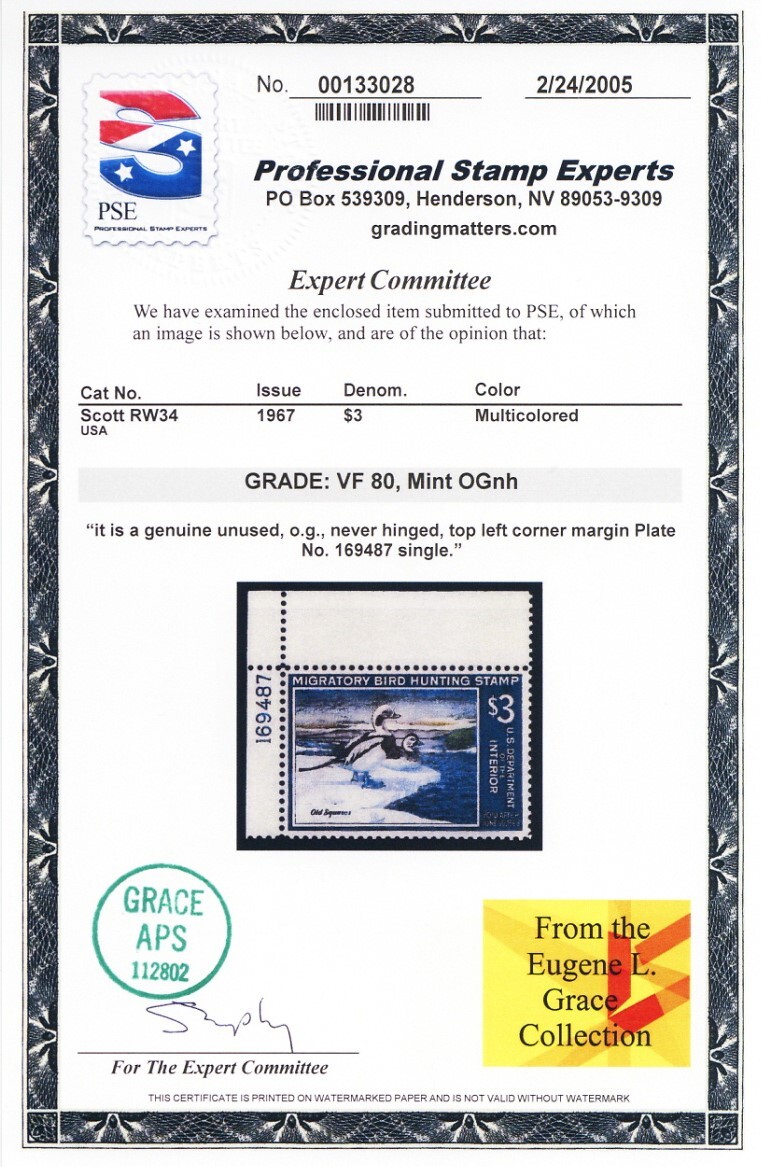 RW34, Mint NH VF $3 Duck Stamp - PSE Graded 80 Certificate * Stuart Katz