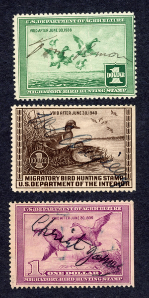 This listing is for a 3-stamp lot of genuine U.S. Federal Migratory Bird Hunting Stamps (Duck Stamps), all offered in used condition with original hunter signatures in ink.