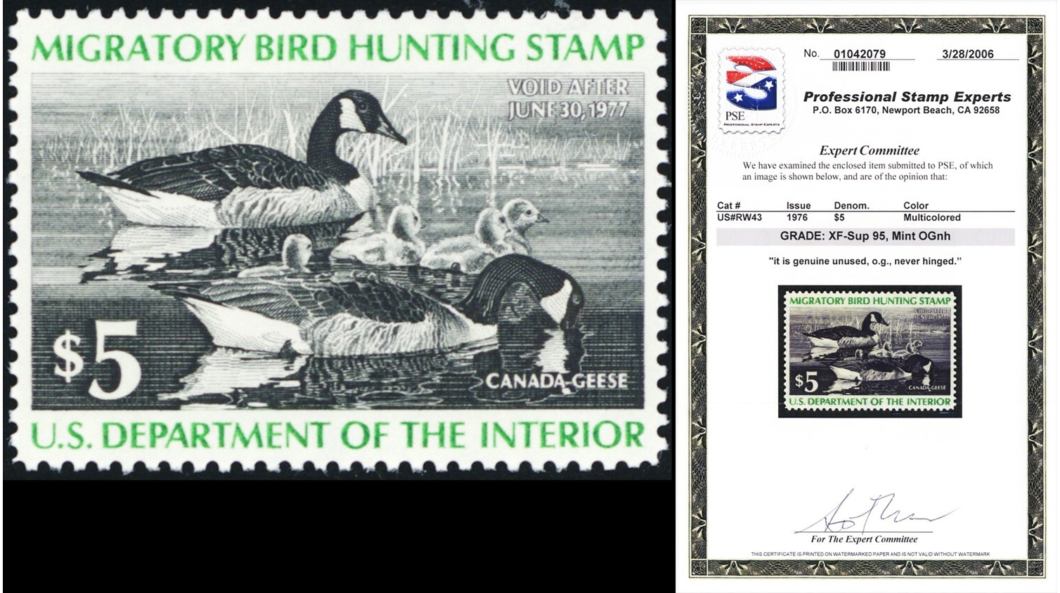 RW43, Mint XF/Superb NH $5 Duck Stamp - Graded 95 PSE Certificate Stuart Katz