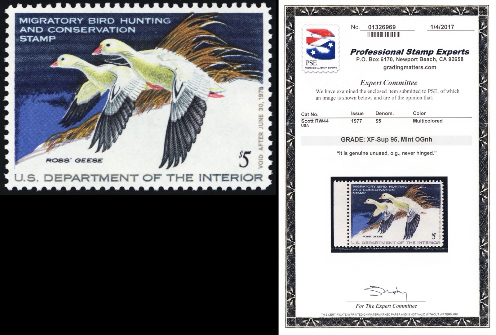 RW44, Mint XF NH $5 Duck Stamp PSE Graded 95 - SMQ $80 * Stuart Katz