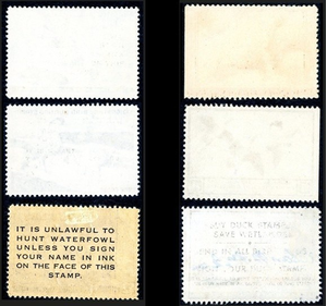 This listing is for a 6-stamp lot of genuine U.S. Federal Migratory Bird Hunting Stamps (Duck Stamps), all offered in used condition, with several showing original hunter signatures in ink.