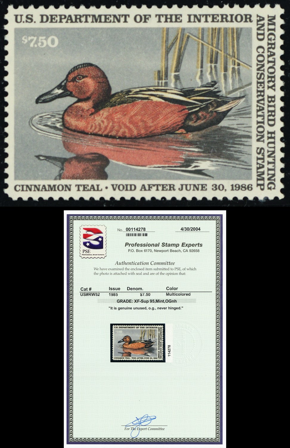 RW52, Mint XF NH $7.50 Duck Stamp PSE Graded 95 - SMQ $70 * Stuart Katz