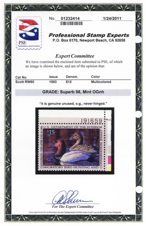 RW60, Mint Superb NH $15 Duck Stamp - PSE Graded 98 * Stuart Katz
