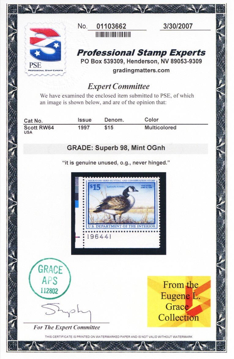 RW64, Mint NH Superb $15 Duck Stamp - PSE Graded 98 * Stuart Katz