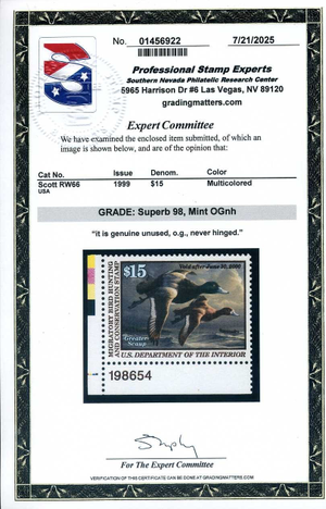 RW66, 1999 Duck Stamp, PSE Graded Superb 98 Certificate, SMQ $140