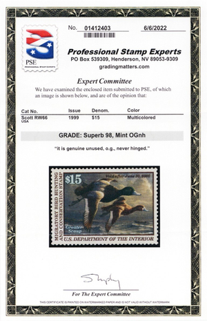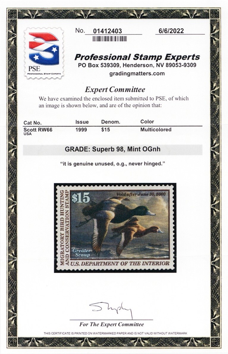 RW66, Mint Superb NH $15 Duck Stamp - PSE Graded 98 * Stuart Katz