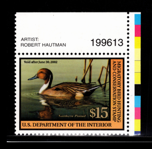 RW68 with plate number, 2001 $15 Duck Stamp, Mint NH, XF-Sup