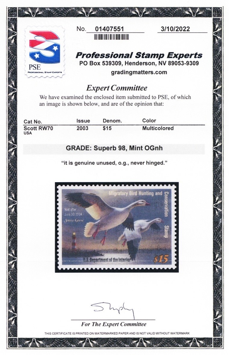 RW70, Mint Superb NH $15 Duck Stamp - PSE Graded 98 * Stuart Katz
