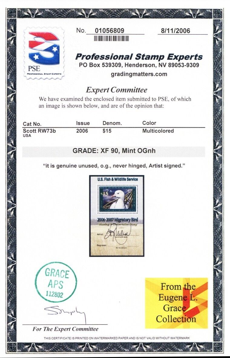 RW73b, Mint NH XF $15 Duck - PSE Graded 90 Certificate SMQ $150 - Stuart Katz