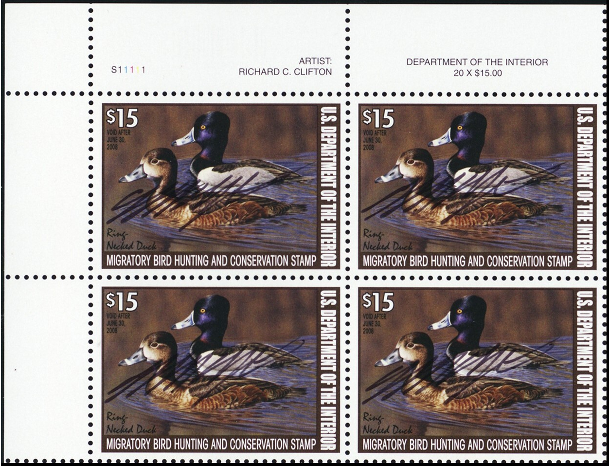 RW74, MNH $15 Duck Plate Block Artist Signed! Very Scarce! * Stuart Katz