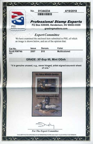 RW74b, 2007 Souvenir Sheet, PSE Graded XF-Sup 95 NH Cert, SMQ $185