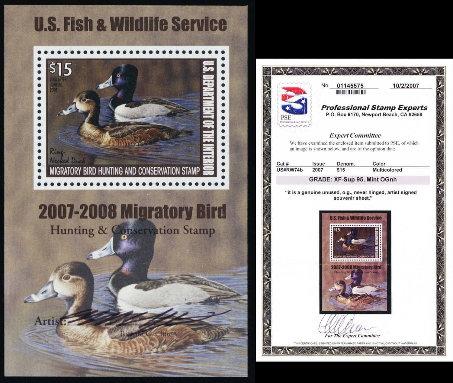 RW74b, MNH $15 Duck Souvenir Sheet - Graded 95 PSE Certificate - Stuart Katz