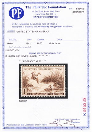 RW9, Mint XF NH $1 Duck - With Graded 90 PFC Certificate * Stuart Katz Description:
