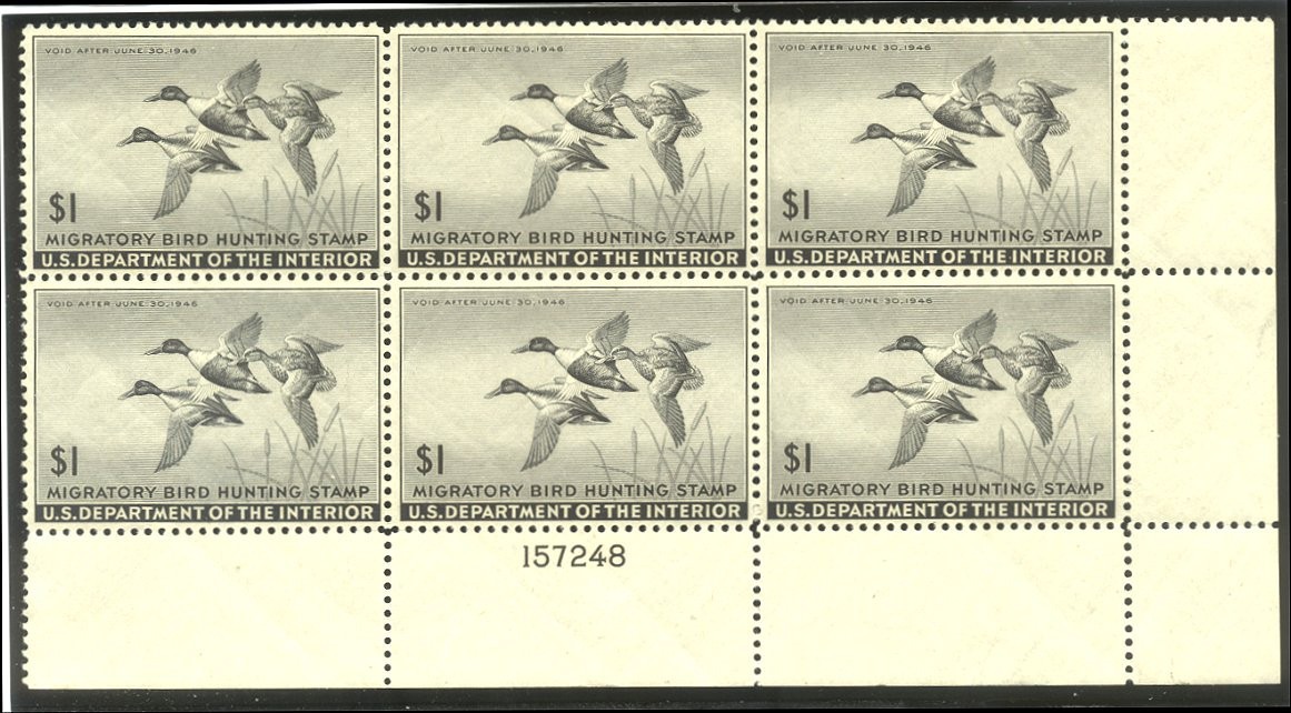 U.S. #RW12 Mint VF NH Plate Block - 1945 $1.00 Shoveller Ducks