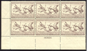 Scott #RW20: 1953 $1.00 Blue-Wing Teals Centering & Condition: Mint. Fresh. Very Fine Plate Block. Reverse (Gum Side): Original gum. Never Hinged. Faults / Imperfections: None The item pictured is the actual item you are purchasing, unless otherwise noted. I also offer an interest-free layaway plan. Ask me about it!" All items will be mailed a day or two after payment is received. --------------------------------------------------------------------------------