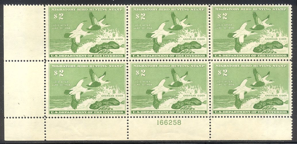 Scott #RW24: 1957 $2.00 Eiders Centering & Condition: Mint. Fresh. Very Fine Plate Block. Reverse (Gum Side): Original gum. Never Hinged. Faults / Imperfections: None The item pictured is the actual item you are purchasing, unless otherwise noted. I also offer an interest-free layaway plan. Ask me about it!" All items will be mailed a day or two after payment is received. ![]() ![]() ![]() --------------------------------------------------------------------------------