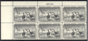 Scott #RW25: 1958 $2.00 Canada Geese Centering & Condition: Mint. Fresh. Very Fine Plate Block. Reverse (Gum Side): Original gum. Never Hinged. Faint bend upper right selvage. Faults / Imperfections: None The item pictured is the actual item you are purchasing, unless otherwise noted. I also offer an interest-free layaway plan. Ask me about it!" All items will be mailed a day or two after payment is received. --------------------------------------------------------------------------------