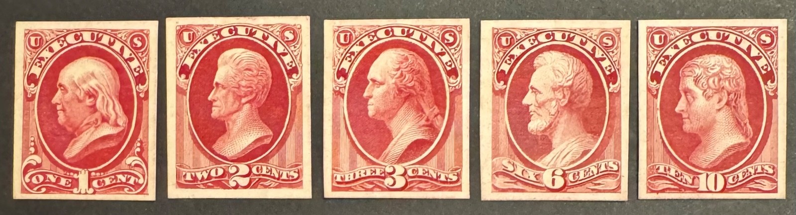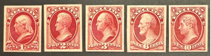 Offered is a complete 5-value set of U.S. Executive Department Card Proofs from the 1873 Official Issue. These are genuine Scott-listed card proofs (P4) printed on original thick card stock with brilliant color and sharp impressions.
