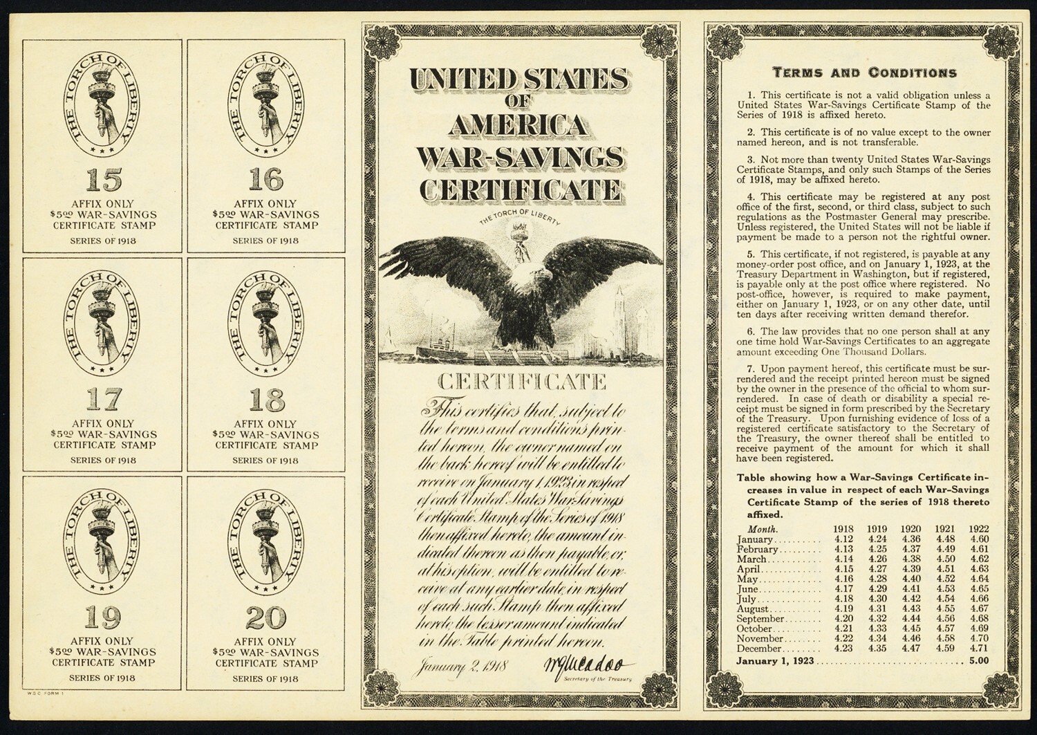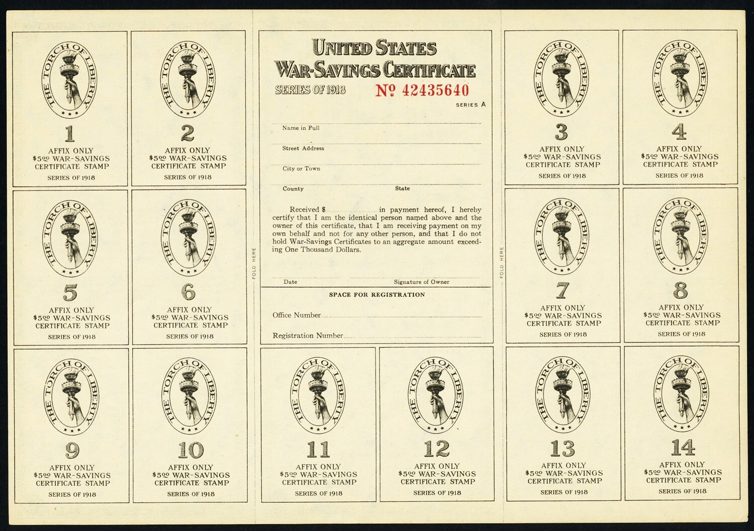 1918 Unused War Savings Certificate For WS2-3 Stamps * RARE! ** Stuart Katz