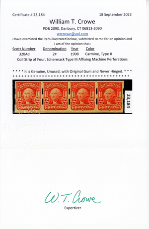 320Ad, Mint NH 2¢ Schermack Type III Machine Perforations With Cert Stuart Katz