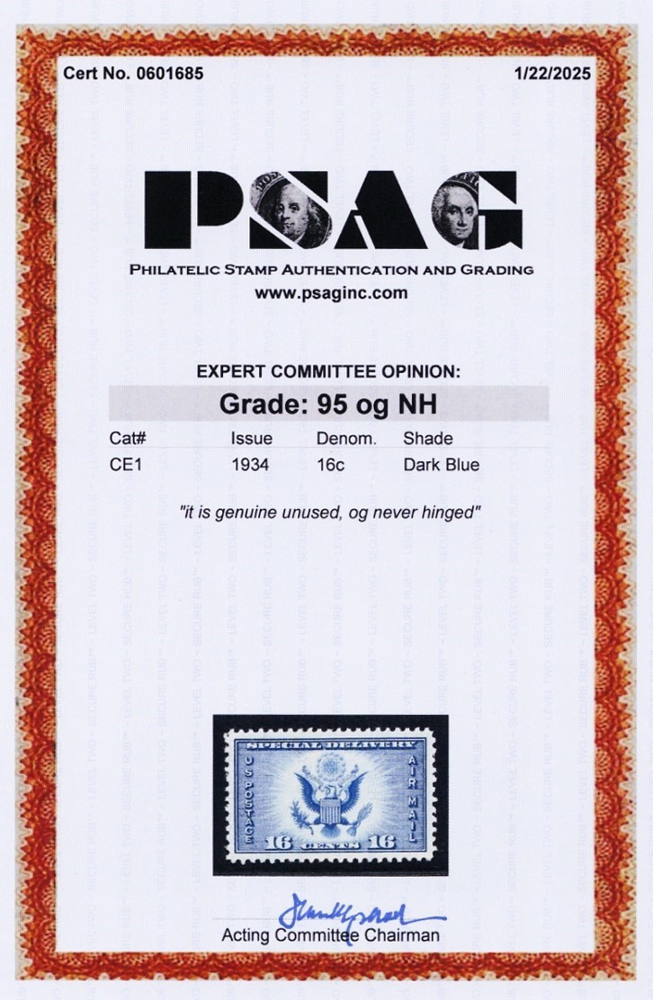 CE1, Mint Superb NH 16¢ With Graded 95 PSAG Certificate ** Stuart Katz