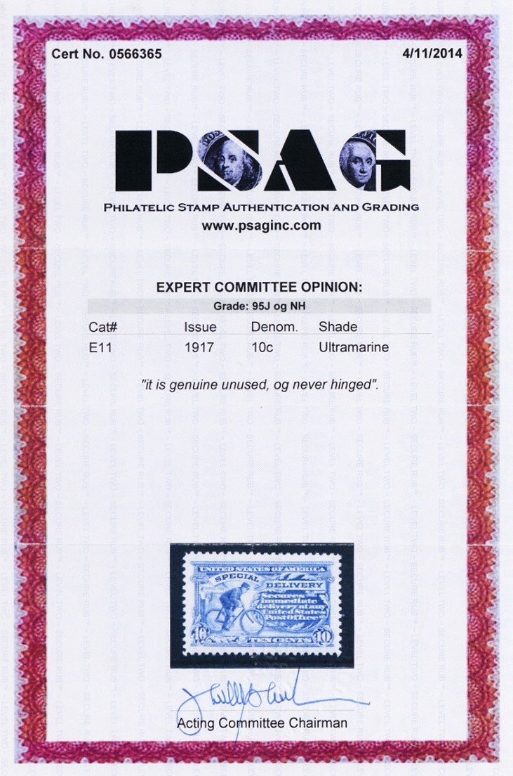 E11, Mint XF NH 10¢ - With Graded 95J JUMBO PSAG Certificate - Stuart Katz