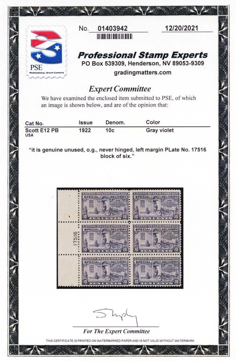 E12, Mint F/VF NH 10 ¢ Plate Block of Six With PSE Certificate - Stuart Katz