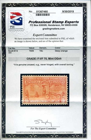 E13, 15¢ Special Delivery, PSE Graded F-VF 75 NH Certificate, toning, SMQ $50