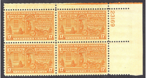Scott E18 XF MNH OG  1944 17c MOTORCYCLE SPECIAL DELIVERY PB Upper Right POSITION. The Special Delivery stamps with the Motorcycle driven carrier are always popular for collectors and Harley-Davidson enthusiasts. It was the first US stamp to display a motorcycle on it.
