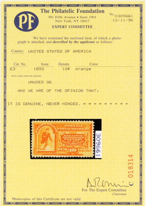 No refunds will be made after 60 days after the sale date unless extra time is granted. Due to the high cost of obtaining certificates we will only refund the cost of the stamp and not the cost of the certificate. For U.S. stamps only certificates from either APS, PSE or from the Philatelic Foundation are accepted, however "graded" certificates or "encased" items are not accepted.