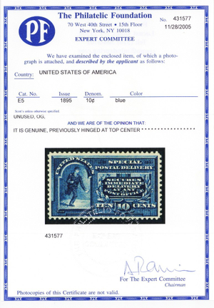 No refunds will be made after 60 days after the sale date unless extra time is granted. Due to the high cost of obtaining certificates we will only refund the cost of the stamp and not the cost of the certificate. For U.S. stamps only certificates from either APS, PSE or from the Philatelic Foundation are accepted, however "graded" certificates or "encased" items are not accepted.