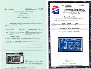 Due to the high cost of obtaining certificates we will only refund the cost of the stamp and not the cost of the certificate for stamps that sell for less than $250 that come back with a negative certificate. Stamps that sell for above $250 will receive a full refund for both the price of the stamp and cost of the certificate if it should come back not as described. For U.S. stamps only certificates from either APS, PSE or from the Philatelic Foundation are accepted, however "graded" certificates or "encased" items are not accepted.