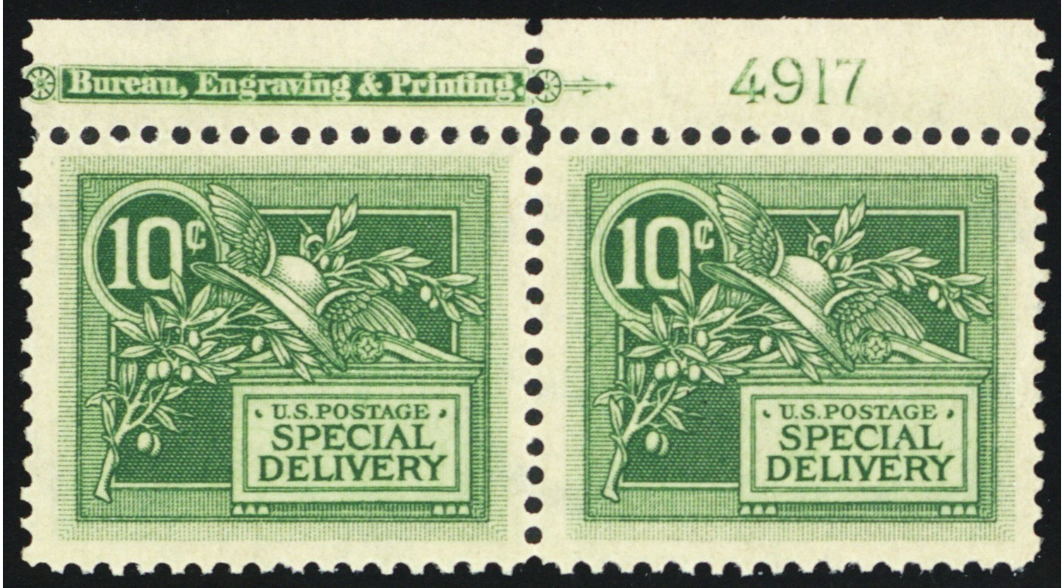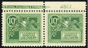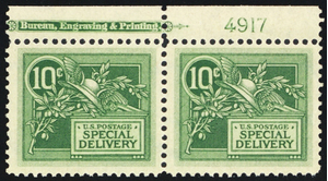 E7, Mint VF NH 10¢ Imprint & PL# Pair SCV $280.00 - Stuart Katz
