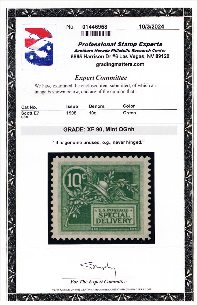 E7, Mint XF NH 10¢ - With Graded 90 PSE & PF Certificates - Stuart Katz