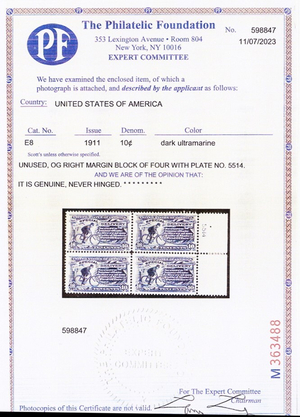 Due to the high cost of obtaining certificates we will only refund the cost of the stamp and not the cost of the certificate for stamps that sell for less than $250 that come back with a negative certificate. Stamps that sell for above $250 will receive a full refund for both the price of the stamp and cost of the certificate if it should come back not as described. For U.S. stamps only certificates from either APS, PSE or from the Philatelic Foundation are accepted, however "graded" certificates or "encased" items are not accepted.
