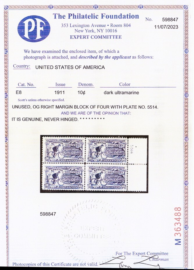 E8, Mint F-VF NH 10¢ Special Delivery PFC Certificate (Copy) - Stuart Katz