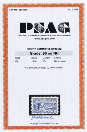 E9, Mint XF NH 10¢ - With PSAG Graded 90 Certificate * Stuart Katz