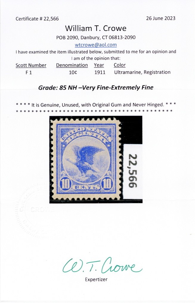 F1, Mint VF/XF NH 10¢ Registry Stamp With Certificate * Stuart Katz