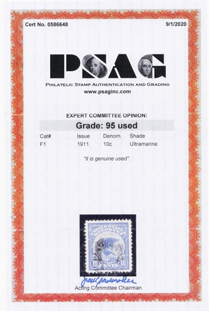 F1, Used XF/Superb 10¢ Registry - With PSAG Graded 95 Certificate - Stuart Katz