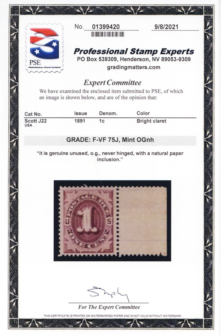 J22, Mint VF NH 1¢ Postage Due - PSE Certificate - Stuart Katz