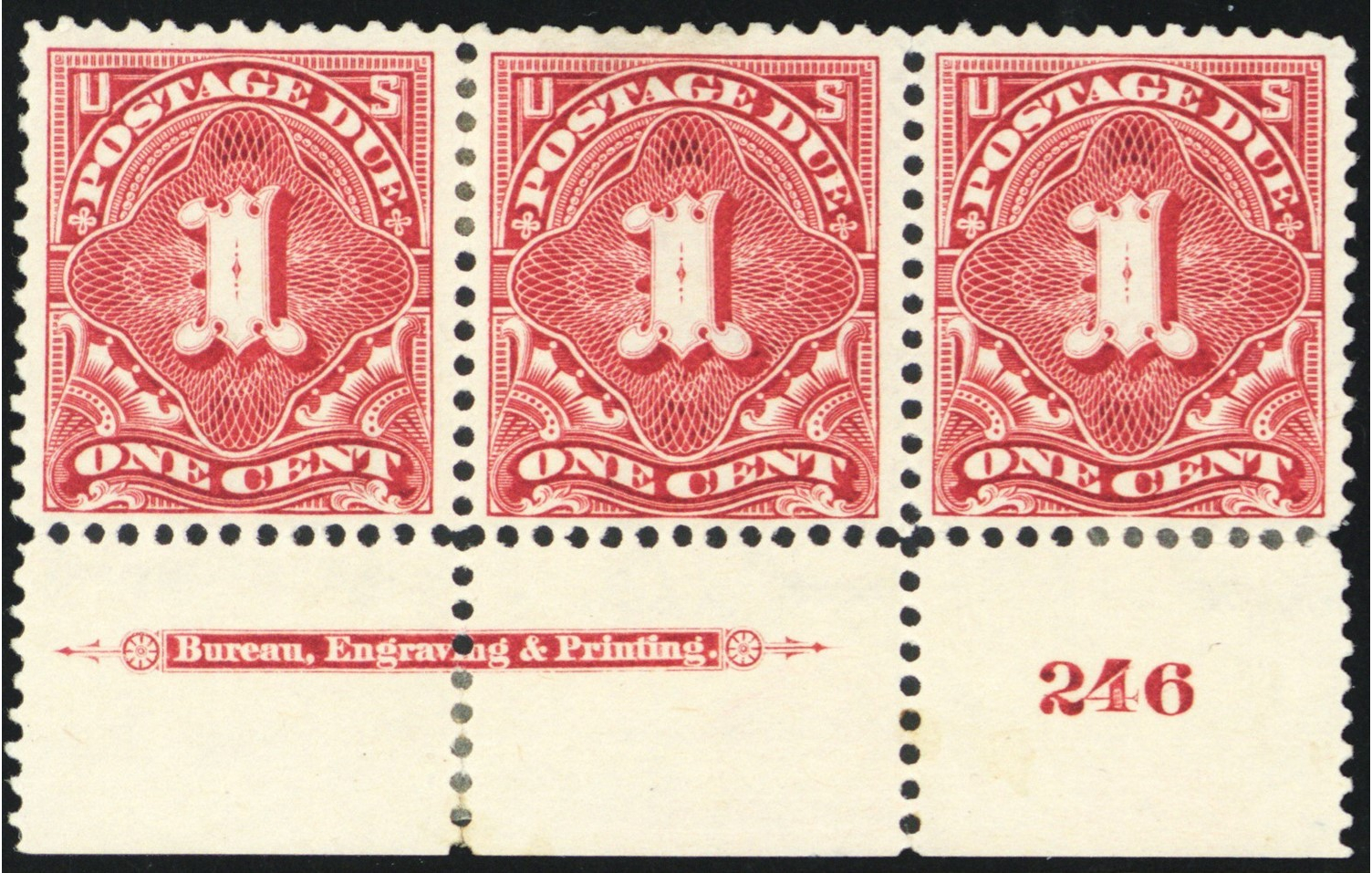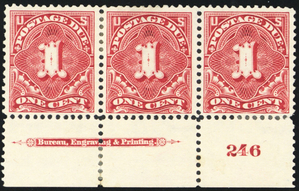 J38, Mint 1¢ HR PL# & Imprint Strip of Three - SCV $60.00 - Stuart Katz